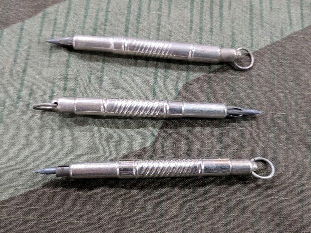 These are pre-war small mechanical pencils. They almost appear to have been designed as a sort of key chain. They still have a small piece of pencil lead inside. This is a great pocket size pencil. They are new dead stock from the original box. The price is for one. They measure about 3' long.