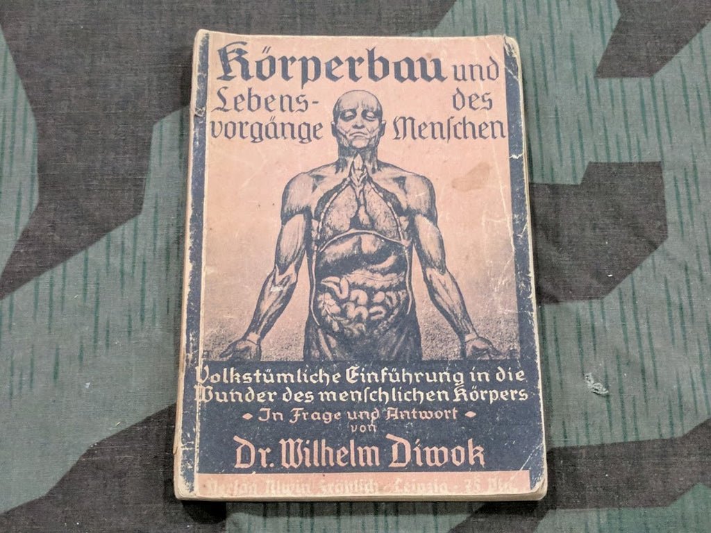 Original 1941 worn medical book covering the basics of human anatomy. It is staying together just fine but the spine is a little blown apart at top and bottom and the book is a little worn around the edges. It is filled with diagrams and drawings. It measures about 6 5/8' x 4 3/4'.