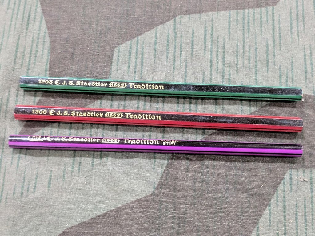 Pre-war Staedtler set of 3 colored pencils: 1 x red, 1 x green, 1 x purple. Perfect for your map case. The pencils are just a little bit larger than normal pencils. New old stock and in good condition. The purple one is round and the other two are hexagonal. Original color pencils are harder to find and are an important part of a complete map case.