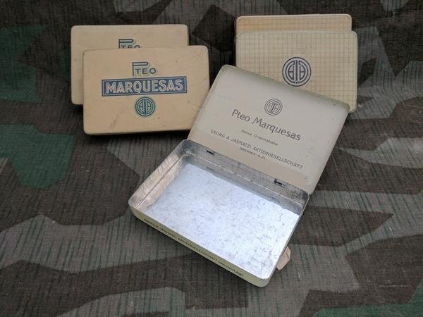 Pteo Marquesas Jasmatzi cigarette tin. The tin is empty, but it originally contained 35 cigarettes. Price is for one. They are all in good condition but do show some general wear, light discoloration and scratches. They measure about 4 1/4' by 3'.
