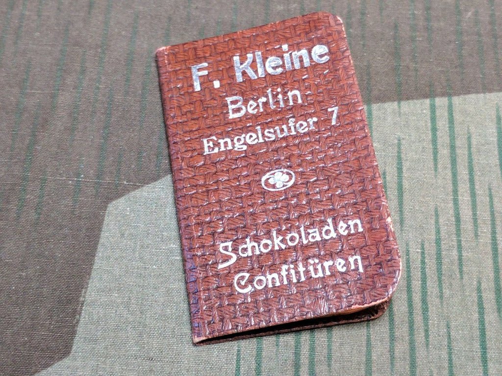 Pre-war advertising notebook for a chocolate and candy company in Berlin. 'F Kleine Berlin Engelsufer 7 Schokoladen Confitüren' It is small, measuring about 2 7/8' by 1 3/4'. The paper inside is graph paper. It is in overall good condition with minor wear: light staining/discoloration and a few creases on the pages.