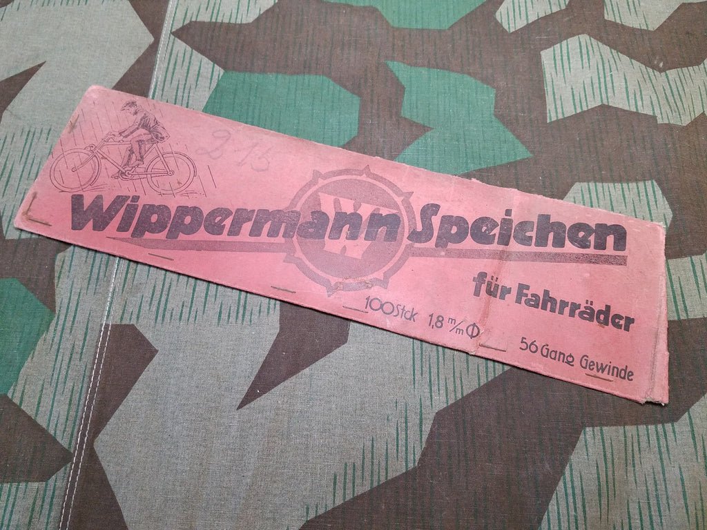 Packet of original Wippermann Speichen pre-war bicycle spokes. There are supposedly 100 inside, but I did not count them. The few I pulled out looked like they were in good condition. They are basically 21 1/2 cm long (~8 1/2'). 1.8 mm in diameter. The envelope is a little dirty but still in overall good condition. The package measures about 13 1/2' X 3 7/8'.