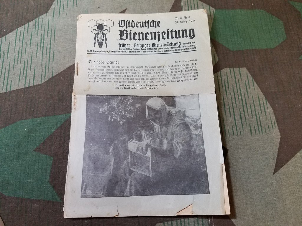 Ostdeutsche Bienenzeitung beekeeper's newspaper dated June 6 1944. It is a smaller size, measuring about 9 1/8' by 6 1/4'. It is in OK condition. It has been folded in half and there is a lot of wear and rips along the edges and the spine. The staples have rusted slightly. This is an interesting example for your collection since it shows that ostdeutsche doesn't necessarily mean something is post war.