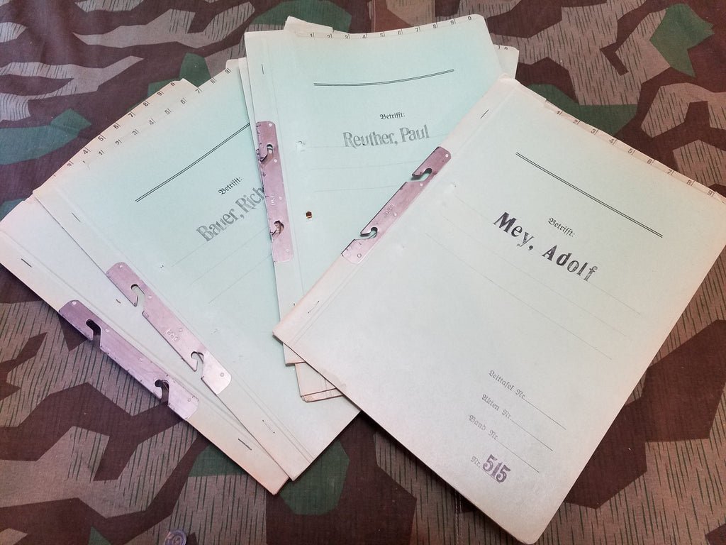 Original DRP marked file folders designed to organize groups of documents in a 2 ring binder. If you are looking for original file folders, it won't get much better than this. Each file folder not only mounts into a 2 ring binder quickly and easily (thanks to its Deutsches Reichs Patented design), they also have the brass strip style 2 hole mount, to hold pages securely. You can finally put your 2 hole punch to work.The price is for one.All have been written on or marked in one way or another. No choice. If you wanted to reuse it you could paste a piece of paper over the old writing. I see this done a lot on period folders, notebooks, etc... so it wouldn't be out of place. They are in good usable condition with some fading around the edges and the brass strip has worn a hole in the outer cover on some of them from 80 years of rubbing. It may ship rolled up. Each measures 13 1/2' tall by 9 7/8' wide.Every army runs on paperwork; this is how it stays organized.