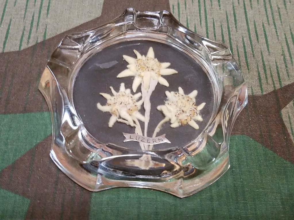 Glass ashtray with real edelweiss flowers under the glass. Luzern is the German name for Lucerne, a town situated along the lake and between mountains in Switzerland. The bottom is marked 'Ges. Gesch.' It is in overall good condition, there is some sticker residue on the top and the bottom has some scratches. It measures about 4 1/4' across.