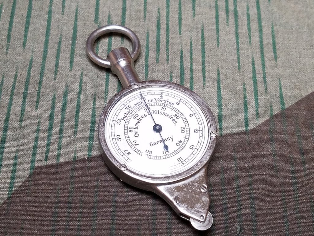 Original measuring device for maps. You just run the little wheel along your route on the map and the dial will tell you how far it is, based on the scale of your map. It is about 3' long.