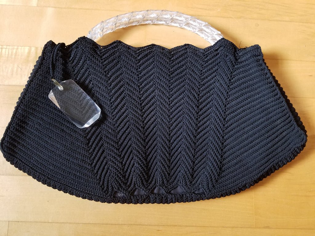 Vintage 1940s large black crochet purse with twisted lucite handles and a big lucite zipper pull. This oversized handbag measures about 17' at the widest and 9.5' tall (not including handles). It is in very good condition. Inside there is a small zippered compartment (the zipper to this is a little sticky). A great accessory for any outfit!