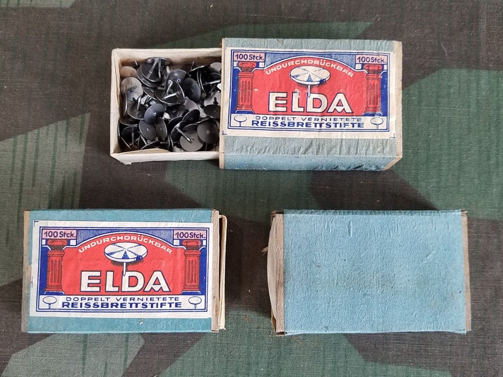 Original 1930's/1940's thumb tacks. These are new old stock, coming out of the original cardboard box. Each thumb tack carton is made from paper covered wood. Each box is supposed to contain 100 tacks but we have not counted each box; they all do have tacks in them.The color on some of the boxes is good but some show light fading or wear. The boxes do show some storage wear.Price is for one box of tacks.