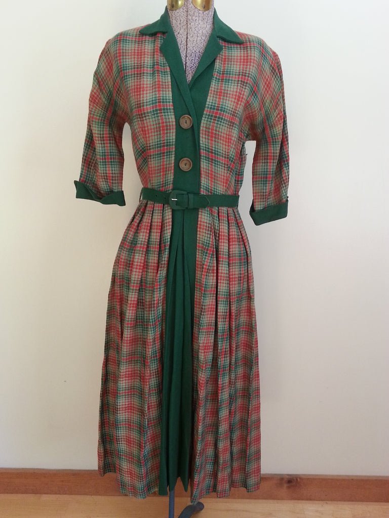 Vintage 1940s red and green plaid dress with belt.MEASUREMENTS (approximate):Bust - 37'Waist - 26'Hips - fullLength 45 1/2'The label sewn inside is 'Rae Mar Juniors.' It closes with a metal side zipper - the buttons are for decoration only. There are shoulder pads sewn in.The dress is in decent wearable condition but it does have a few issues. The most noticeable of which is wear to both armpits - the material in that area has gotten fuzzy and the colors have blended a little. It also has some pulls in the fabric. On the front, near the buttons, there are a few spots and pin-prick holes. The collar has some wear and discoloration. There is a repair in one of the pleats in the skirt (not seen when worn).