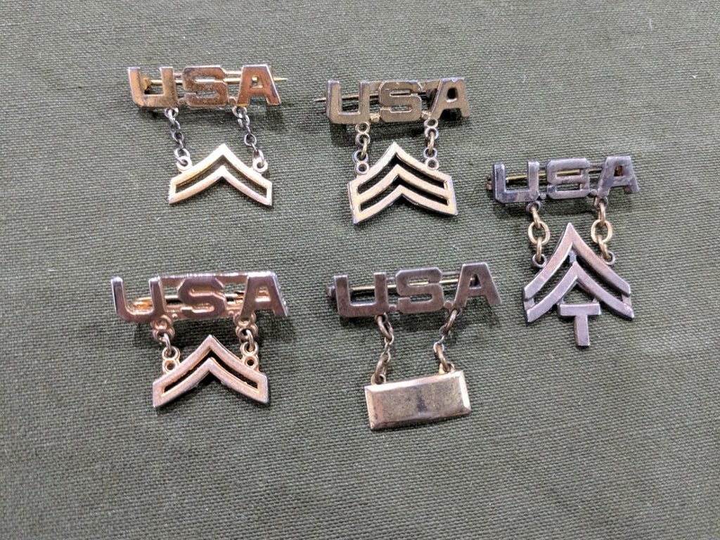 Vintage WWII US army rank sweetheart pins. Price is for one pin. Choose which pin you would like from the drop down menu before adding to cart.They are all in good condition with minor wear / tarnishing. All are marked Sterling expect for the sergeant pin and one of the corporal pins (see photos). The USA portion measures about 1' across.