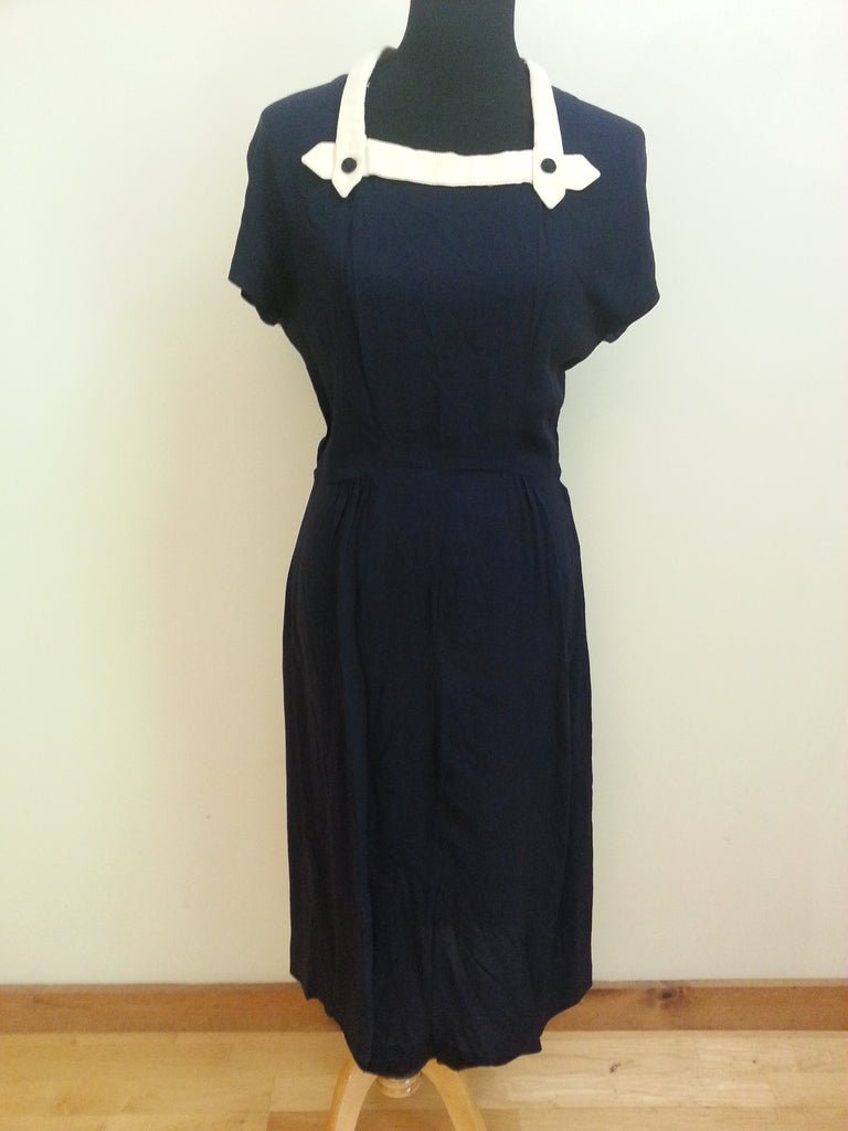 Vintage 1940s dark blue rayon dress with white trim.MEASUREMENTS (approximate):Bust- 37 1/2' - 38'Waist- 29'Hips- 36'Length- 46 1/2'The dress zips up the side. It has decorative buttons on the white trim along the neck. It is in good condition overall. There are a few spots and light stains on the white trim. There is some light discoloration / fading along the shoulders; it is noticeable, but not too distracting. Part of the bottom hem has come unstitched.