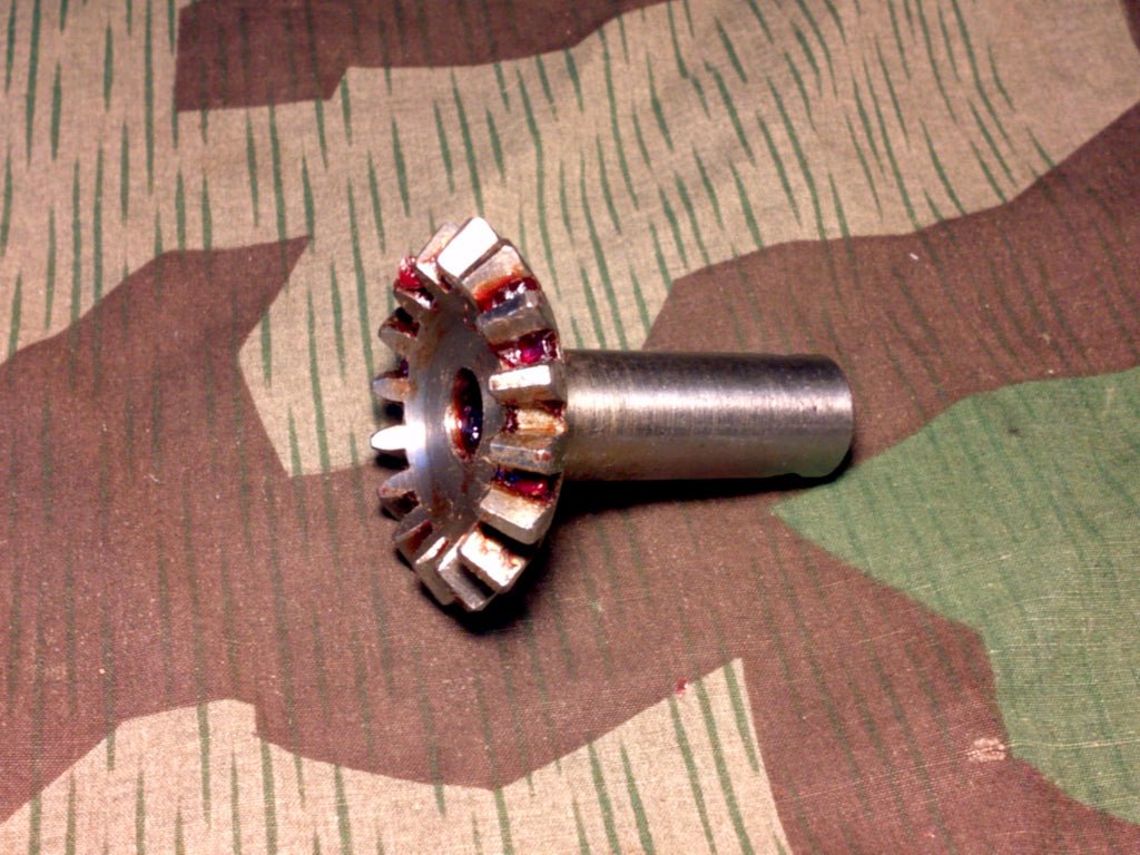 Original WWII German replacement 8cm Gr.W.34 mortar parts. Many parts are still partially coated in a red sealant to provide corrosion protection. The coating is original German also.This is the gear that the elevation knob is directly mounted to and it goes inside the yolk to drive the elevation screw up and down.Parts are in great condition. Markings may vary; some parts have no markings. Only 1 available - no hope of ever finding more.