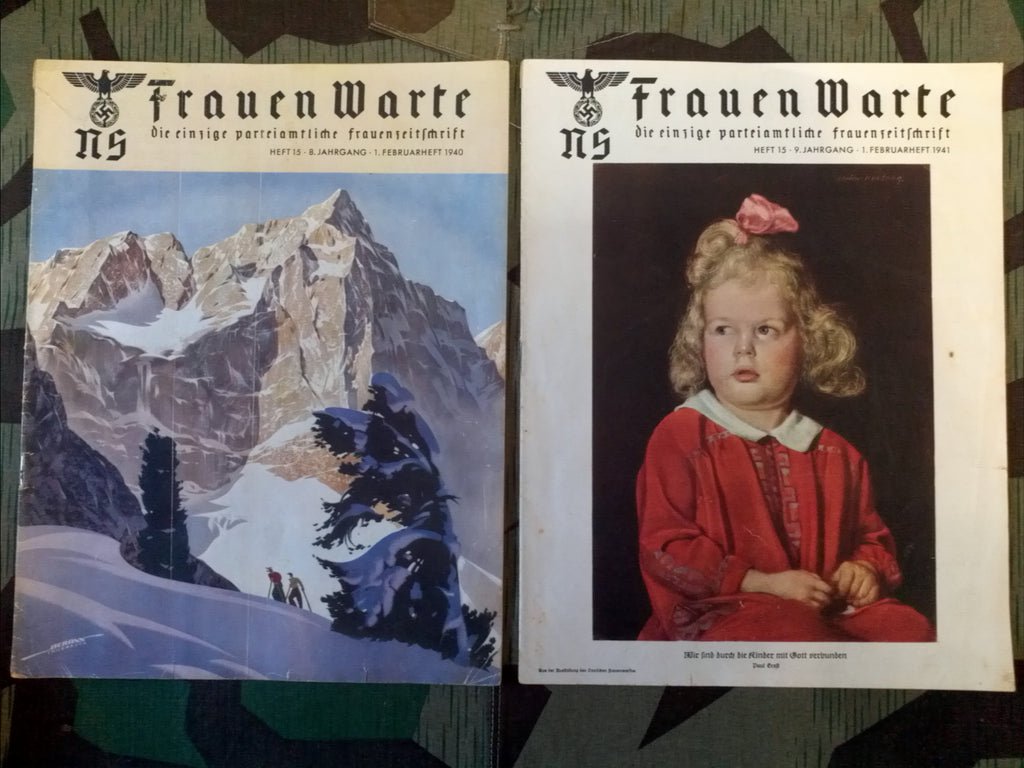 NS Frauen Warte magazines from 1940 and 1941. Price is for both magazines.Frauen Warte was a biweekly Party magazine for women. In 1939, its circulation was 1.9 million. The magazines contain articles about farm life, children, and roles for women during the war (DRK nurse, etc) amongst other things. The also have a lot of advertisements, which are interesting on their own.The magazines are in good overall condition but they do show wear: some light staining from storage, light creases and small tears on the edges.