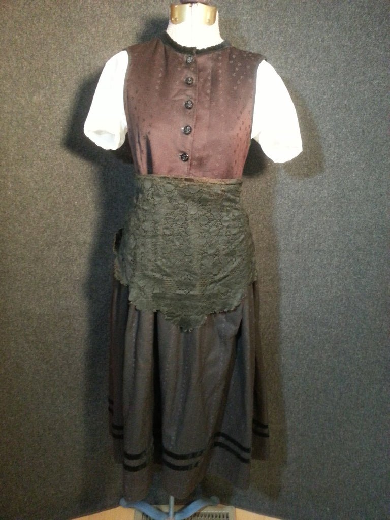 Vintage antique pre-WWII German dirndl (traditional dress). Although, this dress dates to well before WWII, dirndls experienced a resurgence of popularity in the 1930s and 1940s.MEASUREMENTS (approximate):Bust - 32 1/2'Waist - 32'Hips - freeLength - 43'Shoulder Seam to Shoulder Seam - 13 1/8'This dress came from a trunk in Munich. It has a bit of an odd cut (odd to Americans, but very common on old German items) where the armholes seem small and higher up. This outfit is three pieces: the main wool dress, a lacy apron and a short white undershirt (modern, included to get the look correct).The top of the dress is a dark pink hue and has flower and geometric designs woven into the material. It buttons with carved glass buttons (the top buttons is different; the rest of the buttons have flowers carved in them). The skirt is made of two slightly different materials (very minor differences between the back and front). The light blue designs on the skirt are painted on! This dress is truly a piece of art! The collar and the bottom of the skirt are trimmed in velvet.The bottom hem of the skirt has a plaid material on the inside - the same material as German army bed sheets. This pattern was common for bed sheets in hotels before the army used the pattern. It is possible that this dress belonged to a woman who ran a Gasthof bed and breakfast before the war.There is ruching along the waist. It has a hook and eye at the waist and a snap underneath on the skirt (covered by the apron). The skirt even has pockets. It is in good condition with only a few minor repairs.The apron is a small, short lacy piece (so as not to cover up too much of the decorative skirt). The apron ties in the back. It shows discoloration along the top and a bit of fraying and small repairs (it can be folded slightly over itself to hide the discoloration).The white undershirt is more newly made (within the last 30 years) but is included to give the dirndl the correct look. It has a design on the sleeves and an elastic waist. It may have very minor discoloration.Free shipping in the US.