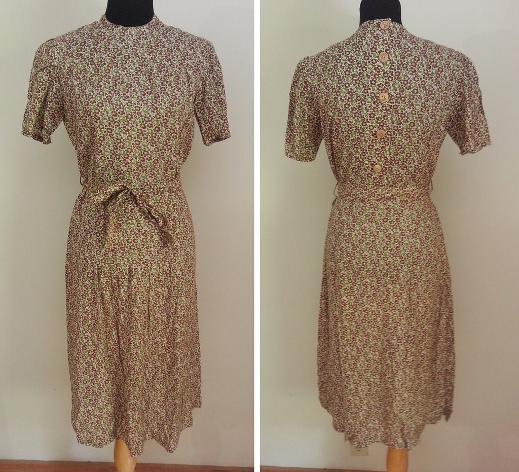 This is a lovely 1930s handmade cotton / rayon blend summer weight dress in good condition.MEASUREMENTS (approximate):Bust- 39'Waist- 31-32'Hips- 38'Length- 44'During the 1930s, the woman who made this was a seamstress who worked from her house and her husband was a traveling salesman. After the war, the area of Germany she lived in became East Germany and, under communism, she was not allowed to continue working from home. She packed away all of her remaining inventory in the attic and she and her husband went to work in a factory. Some of the dresses were still folded up from when they were originally put away. These dresses have been untouched since they were lovingly put into storage after the war. They may never have even been worn!The dress is a very breathable lightweight fabric. It is made of (what appears to be) a cotton / rayon blend. It has a green and brown flower print with wood buttons up the back. The wood buttons have hand painted flowers on them. The dress has a little bit of extra material at the shoulders, sewn in such a way to make shoulders fill out (this is a typical German pattern, slightly mimicking traditional clothing which was a very popular style of the time). The collar area has a nice design sewn in and the waist area has pleat-like designs sewn in. The dress has a matching belt that ties around. There is a side opening, but no closures.The dress is new old stock and in overall good condition. We have a few available and some have slight issues. There may be a few very light brown spots in the material (not very distracting or noticeable; see photo). There may also be slight fraying or imperfections in the fabric. It may still have some of the fold lines from storage.We have more dresses made by the same woman availablehere(including this style dress - with the same flower print - inorangeandblue).