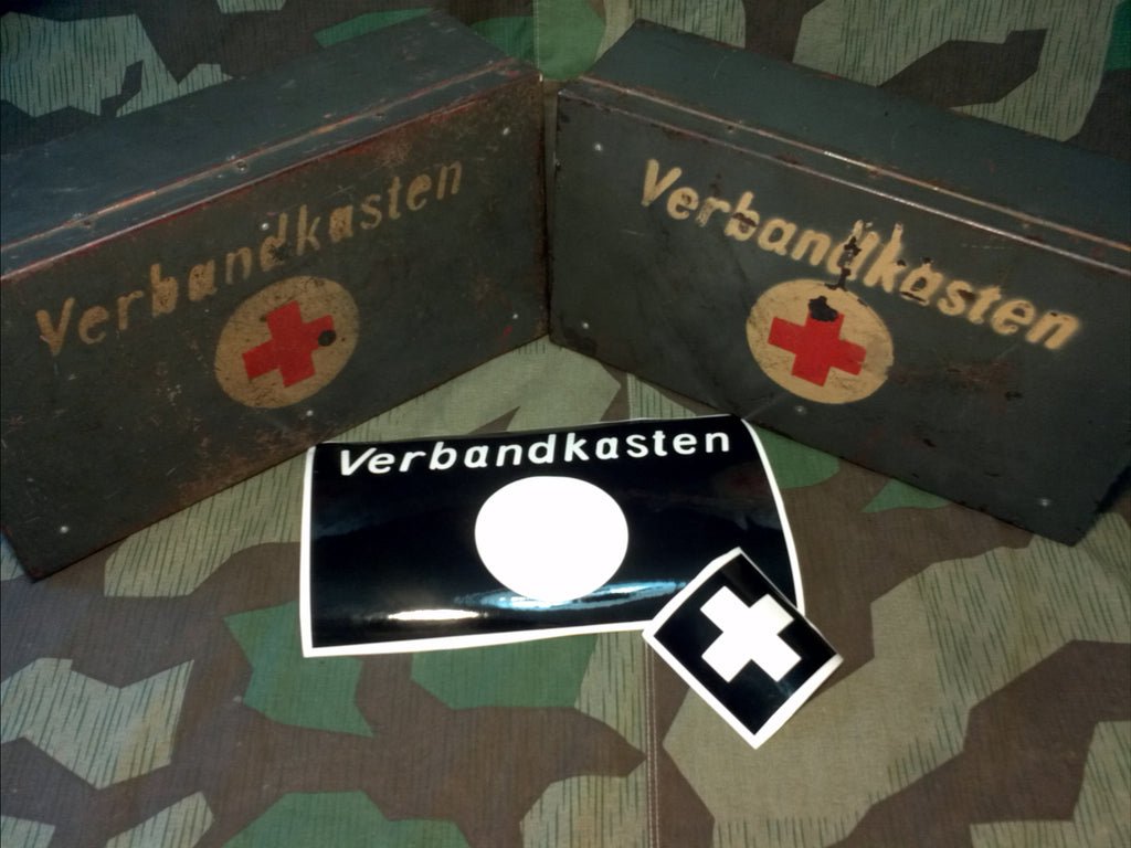 This is a vinyl stencil set including the white layer and red layer for the Verbandkasten. It is copied from an original box. The boxes are not for sale.To use the stencil, I recommend applying very weak masking tape over the stencil to hold all the little bits together. This will generally make it easier. I will not put the tape on for you because, if it isn't used quickly, the tape can stick to the stencil, ruining it.When painting your box, if you make the base color panzer gray, then the text could be ordinance tan or matte white.