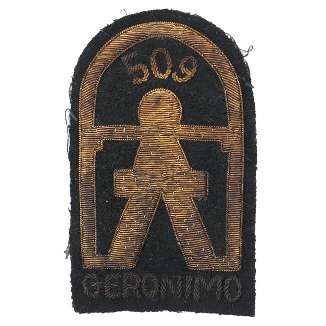World War 2 U.S. 509th Parachute Infantry Regiment 'Geronimo' Patch. The patch is a hand-embroidered theater made patch showing the famous gingerbread man in bullion between '509' and 'Geronimo', also called 'Man in the Door' depicting a simplified rendering of a paratrooper about to jump. Rare original US Airborne patch!