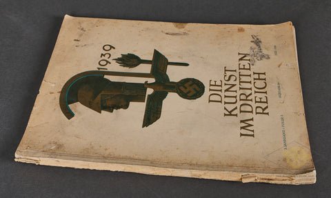 Art in the German Reich. Volume 3, Issue 7 July 1939-Launched in January 1937, the magazine was published monthly and had the particularity of having two variants. Ausgabe A contained only articles and photographs pertaining to fine arts, while Ausgabe B included the fine arts section of Ausgabe A to which was added an architectural section (Baukunst). This scarce copy contains both parts and has its architectural section entirely dedicated to the most iconic building of the TR: the new Reichskanzlei (Reich Chancellery). Inaugurated in January 1939, Albert Speer's masterpiece was the embodiment of the power of the regime and Hitler's megalomaniac vision of a new architectural center for the capital of wartime Germany. The 37 striking b/w and color photographic reproductions of both interior and exterior views depict a building designed to impress and be the seat of a new German Empire. This book measures 14 inches (35.56cm) tall and 11 inches (27.94cm) wide. It is a large magazine. The softcover book has some discoloration to the lower front cover, but otherwise it is in good condition.
