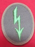 Original era manufacture. An early quality insignia, olive cotton oval with a green cotton embroidered lightening bolt. Unused