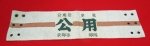 Original era manufacture. White cotton armband with lace holes at each end, machine sewn central red stripe, with machine sewn black kanji lettering. Normal age and wear.