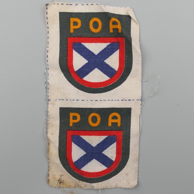 Original set of 2 printed on cloth sleeve-shields as intended for a Russian Volunteer of the 'Russian Liberation Army' or 'POA' (Русская освободительная армия). The POA was also known as the 'Vlasov Army' former Red Army general Andrey Vlasov. The shields are nicely printed on a white linnen background. The shields are a bit wrinkled caused by years of storage. This is an original uncut set of 2 shields, this is how they were issued to the volunteers. Nice original examples in good unissued condition!