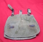 Original era manufacture. Olive green canvas bag with two steel D rings and brown leather securing straps on its flap. Central loop and hook are present. Shows considerable service wear and use, still quite sound for display.