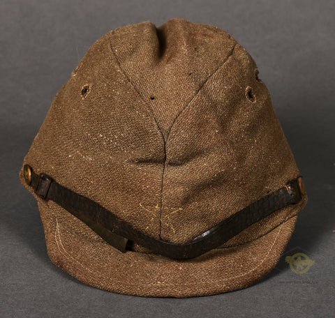 WWII Japanese Army Field Cap-This is produced in olive drab wool and is in sound condition. There is minor wear, some discoloration and a few nibbles. The cloth army star is missing but you can see the stitches where it once resided. The right side of the cap has the initials of the wearer stitched in cloth. The leather chinstrap is present but worn, stiff and split in the back. There are brass buttons holding it in place. Each side has three ventilation holes. It is tied in the back. The interior is fully lined in an off white cheese cloth. It is well marked with maker info etc. There is a dark reddish brown leather sweatband that is very soft and fully intact. A sound example overall!