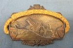 Original era manufacture. A very high quality, die-struck badge in two colors, with a maker marked reverse. Measures 40x62 mm, pleasing silver colored patina with a gold riband at the top.