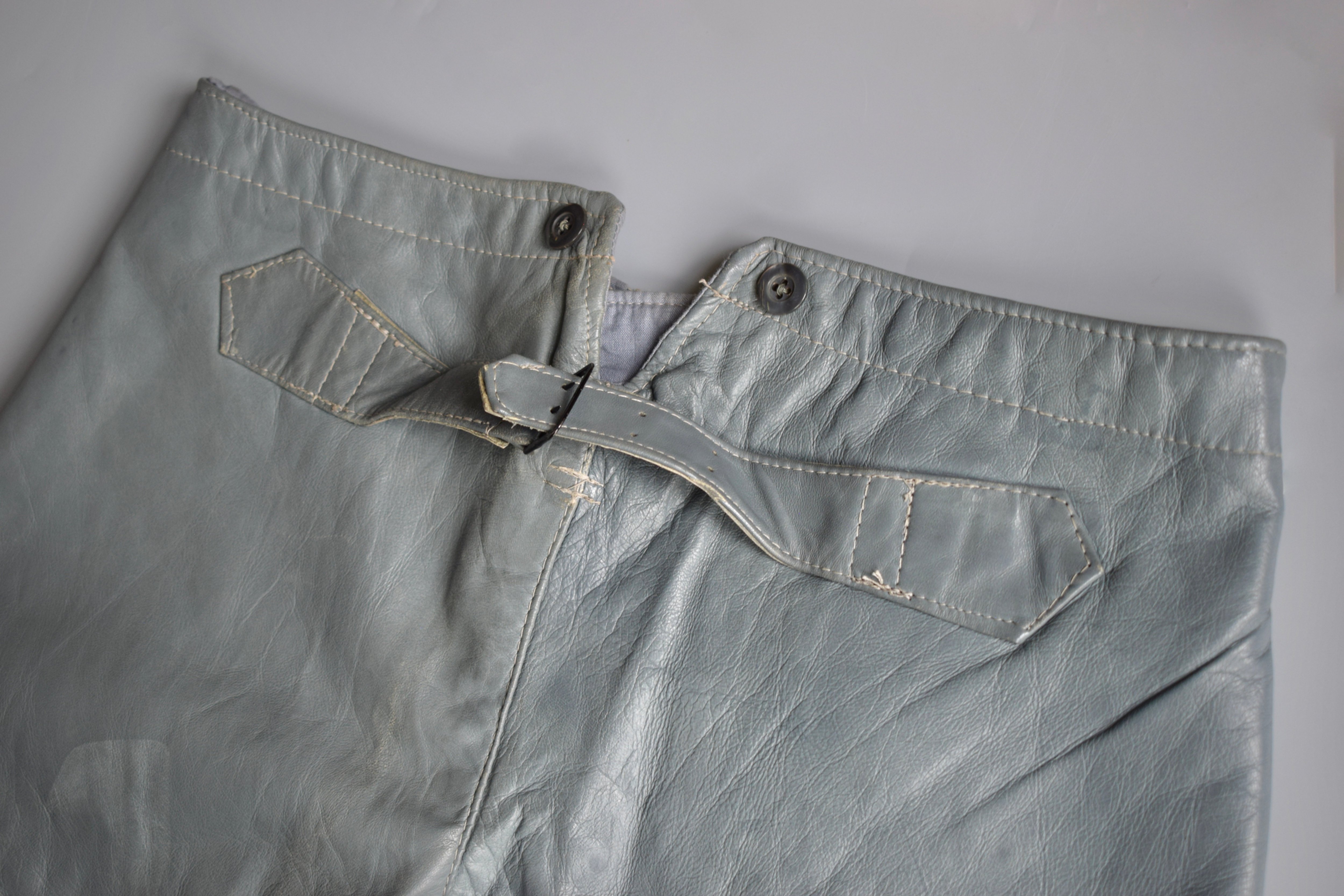 An excellent, original pair of the blue/grey leather trousers as issued to U-boat crews.These trousers remain in very good, supple condition with only relatively minor wear and discolouration from service use.All buttons remain fitted, along with the integral waist belt to the reverse side.A truly wonderful example of their type!