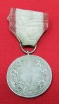 Original era manufacture. Silver disc measuring 32 mm, simple white silk ribbon with red edging. Ribbon shows wear.