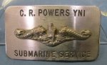 Original era manufacture. A well made buckle, featuring the standard brass friction buckle, which has been soldered to a curved alloy plate, which in turn, has had a full size set of enlisted dolphins soldered to it. Named to the individual as shown, normal age and wear.