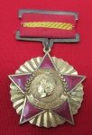 Original era manufacture. Chinese Korean War medal, brass planchet with red enamel decoration displaying the profile of Mao at center. The reverse is marked in Chinese,original ribbon and suspension.