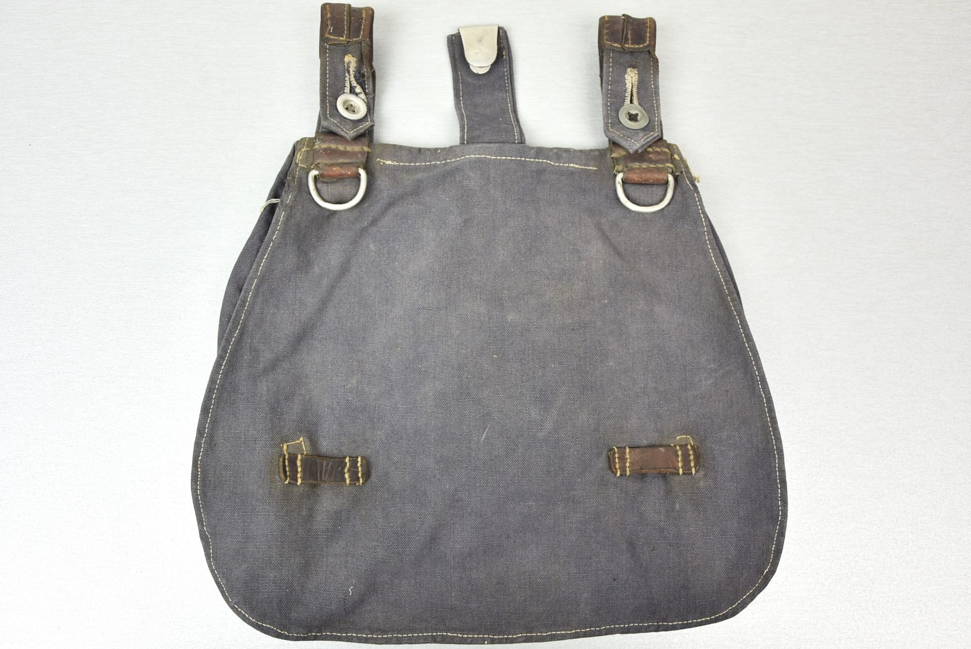 Standard M31 pattern blue Luftwaffe bread bag, executed in canvas cloth, with chocolate brown leather parts. Maker marks are faded due use, most likely made in 1938 (I deem). Complete with all aluminum buttons and hooks.
