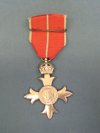 Original era manufacture. Silver cross surmounted by a Kings Cross and suspended from a rose colored ribbon with a central pale gray stripe. Ribbon needs to be resewn to its mounting bar. Clean otherwise.