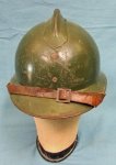 Original era manufacture. A one piece steel helmet with an attached comb, which is soldered in place, not riveted.Green painted exterior, with two plug holes at front from a one-time emblem being attached there.Tan leather liner with brown wool edging, pliable leather chinstrap with a steel adjusting buckle. Small size, normal age and wear.