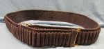 Original era manufacture. Blue woven canvas bandoleer with brass size adjusting loops and tabs. There are 101 (I counted'em 3 times), .30 caliber bullet loops around its exterior, with little wire guides inside each. The bandoleer is in very clean condition, no issues to report, with strong colors, white stenciled markings on the inside.