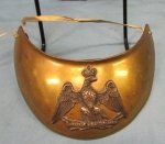 Original period manufacture. Elegant gilded brass gorget with a silver eagle clutching a bundle of lightening bolts in its talons. Blue wool covered reverse, displaying normal age and wear. Often described as worn by officers of the Imperial Guard.
