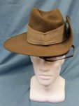 Original period manufacture. Classic Australian Bush hat, dark olive green wool felt with a light gray-green band. Queen's crown cap badge on the turn-up for electrical engineers it appears. Brown leather chinstrap and liner with Made in Australia 1967 in silver paint. Clean, no issues, size marked 7.