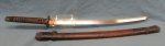 Original era manufacture. Handmade blade, with two mounting holes in the squared off tang. The blade measures 23.5 inches in length, is clean, butnone of the temper line remains visible, few small nicks in the edge, very sharp to the touch. Nice pierced tsuba, with gold highlighted menuki, and a nice gold highlighted pommel, securing peg is missing. There is a leather field cover over the wood bodied scabbard, old electrical tape repair at the throat. Signed blade. Not a stellar example, but an honest old sword regardless.