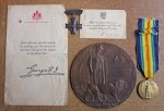 original period manufacture. An emotive grouping of medals and paperwork presented to the family of Private Michael John Welsh, CEF, who lost his life on 27 November 1917. Service number 648950, 26th Battalion. The grouping includes his large bronze Memorial Plaque, Silver Memorial Cross, named British pattern Victory Medal, a memorial sheet from King George, and a small card presented with the memorial cross.Private Welsh was born in 1882, and is buried in the Etaples Military Cemetery near the city of Boulogne. Light age and wear.