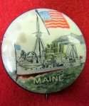 Original era manufacture. Celluloid obverse, with a depiction of the USS Maine, sunk in Havana's harbor in 1898. Measures 32 mm across, pinback reverse. Whitehead & Hoag New Jersey maker.