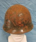Original period manufacture. Standard IJA helmet of WWII, this one displays a post WWII gloss green paint finish mixed with surface corrosion patina. The good news is that all three of the chinstrap mounting loops are intact with three rather salty attaching rings are also there. Portions of the leather liner band remain along with two rather crusty liner pads. Replaced army star displaying the same corrosion finish as the helmet shell.
