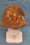 Original period manufacture. A crusty example found on one of the Pacific Islands during aircraft recovery in the 1980's. We purchased this from the man who was involved in that project but sadly he did not remember on which Island it was found. Standard IJA steel helmet with a bullet or shrapnel strike on the rear edge. All three of the suspension liner loops are intact and the shell still has a ring to it when lightly struck. Two rust holes in the crown.
