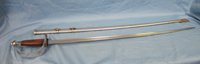 Original era manufacture. Slightly curved polished steel blade which measures 34 inches in length. Simple wooden grip with a chromed steel guard and pommel. Chromed steel scabbard with two carrying rings. Clean overall.