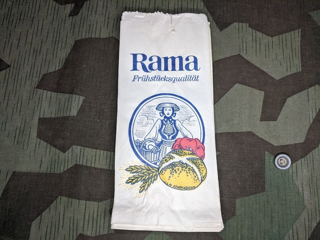 Period Rama Frühstücksqualitätpaper bags for baked goods. I am not entirely sure of the the exact age. I know that Rama was a big brand before and during the war. This is basically what the nice lady behind the counter at the bakery would cram your rolls into.Price is for ten bags.All seem to be in rather good condition. They come from the original bundle so they will have a tear where hey have been ripped off.ADD 3 OR MORE TO CART AND SAVE 15%Discount applied automatically at checkout. Add 3 of ANY items fromthis collectionto save 15%!