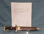 Original era manufacture. A very solid dagger with a polished steel blade with a clear blade motto and makers mark, Gustav Wirth. Veteran bringback, purchased from the family. The blade exhibits cleaning, with portions of the original cross-grain polish remaining on the base of the blade on each side. Mellow patina finish to the upper and lower guard with both emblems in place, district marked on the lower guard Nm. Dark wooden grip displays some typical marring and bumping from handling over the years, with a few thin surface cracks on the top and bottom, no chipping, or missing wood. The steel scabbard body has a few shallow dents, with a brown finish. Scattered denting to the lower scabbard fitting, with the requisite dented ball tip. The dagger comes with a printed note from the daughter of the Veteran who brought the dagger home with him in 1945.