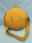Original era manufacture. Very similar in construction to the standard, IW-SAW era issue canteen, but about half again as large. Being of a larger capacity, we used to refer to these canteens as the 'Arizona' canteen back in the day. Likely the army had a more specific name for them, but in either case, they tend to be fairly uncommon. I cannot remember having more than a few of these pass through our hands in the past 40 odd years. This example is quite sound, showing a clear U.S. stencil, with sound stitching, and no major denting to the body. Comes with its original cloth shoulder strap, measures nearly 10 inches across.