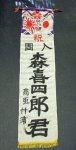 Original era manufacture.A very clean printed silk banner with a fringed bottom, measurements are 8x32 inches with dowel at top and string for hanging. It is named to a soldier named Mori Yoshiro and was presented by Takagyo Takeura. Clean, no holes, stains or tears.