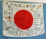 Original era manufacture. Japanese WWII signed silk flag with 9 Temple stamps, measuring 28 x 32 inches.The flag is very clean looking, with some silk separation visible in the Hinomaru, otherwise no issues. Two reinforced corners with tie strings. Named to Sakurai Shou. A good looking flag with a nice assortment of stamps.
