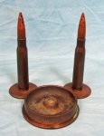 Original era manufacture. A nice trench art grouping made from two types of Japanese shell casings, and two US .50 caliber casings and projectile made into Salt & Pepper Shakers.The .50 caliber rounds have had the lead removed, and have been neatly drilled to allow the salt or pepper to easily pass through the openings. To fill them, you unscrew the casing from the threaded Japanese shell casing base, and voila. you're in business.The ashtray shows cigarette ash staining, and has a threaded center where some type of decoration was once mounted.The bottoms of the Japanese casings are very well marked, with two measuring 50 mm across, and the larger base measuring about 90 mm across. Pleasing brass patina finish, normal age and wear.
